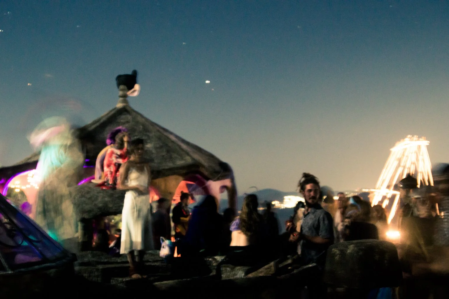 The stage was built with a wooden frame and bamboo exterior, LED outline and custom DJ table. Two geomentric tree platforms, also made from bamboo, allowed for elevated dancing, lounging, and highline acess.